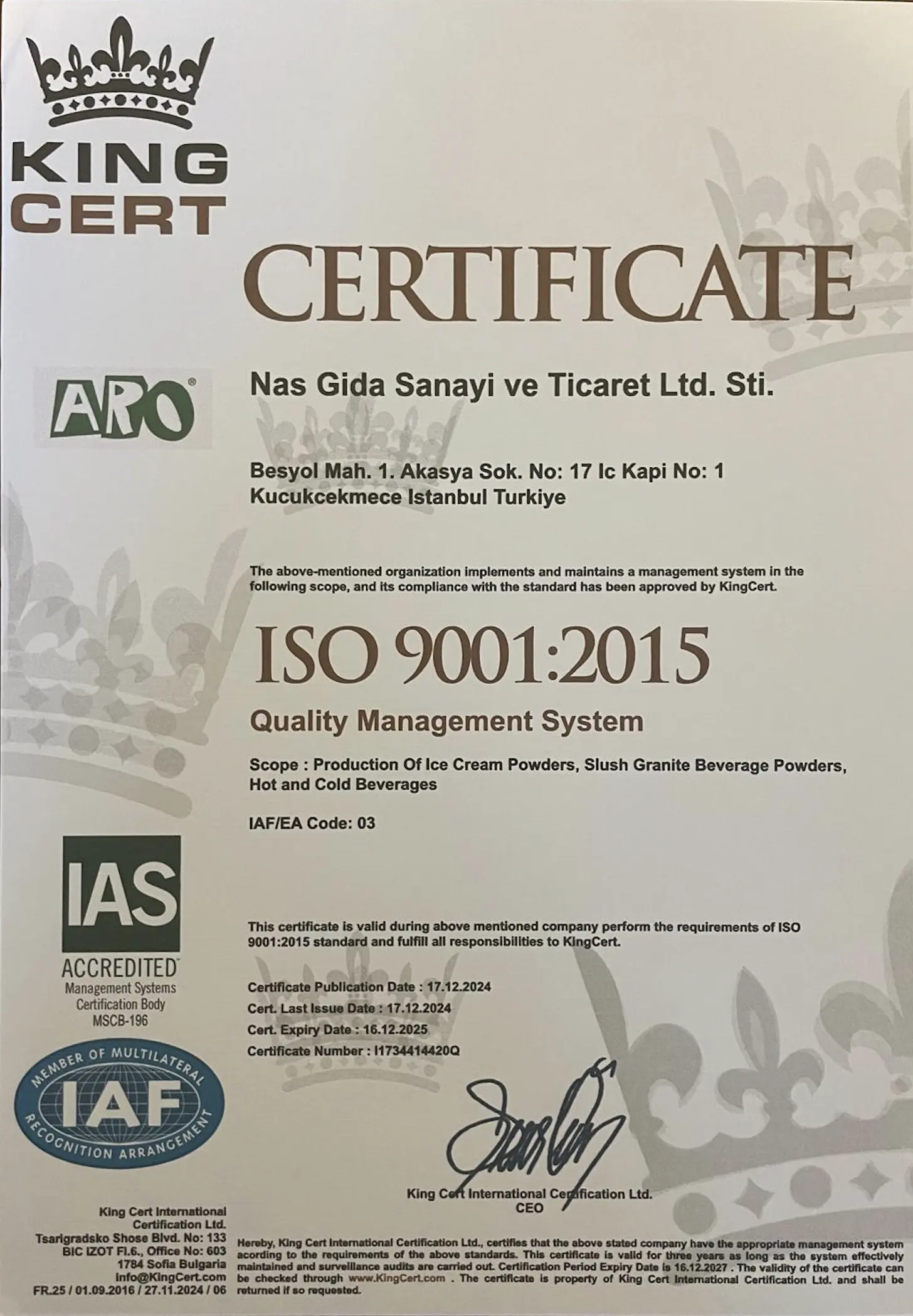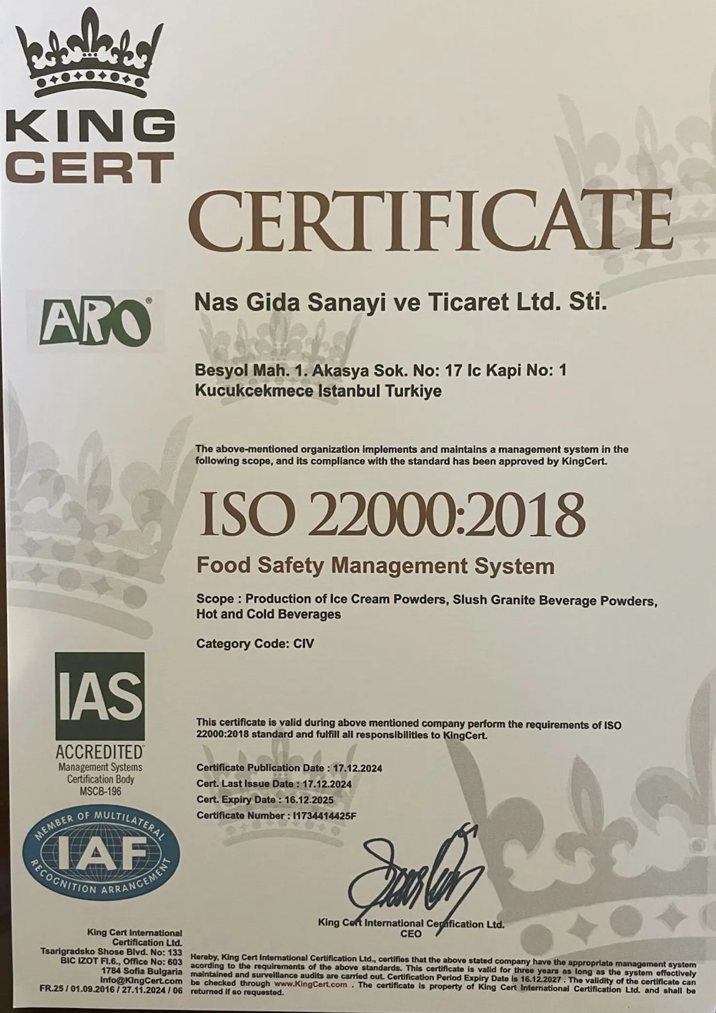 Nas Gıda Sanayi ve Ticaret Ltd. Şti., her yaştan tüketicinin severek tercih ettiği dondurmaların üretiminde kullanılan soft ve endüstriyel dondurma tozlarını geliştiren, sektörde köklü bir geçmişe sahip yenilikçi bir gıda sanayi kuruluşudur. Kuruluşundan bu yana kalite, güven ve sürdürülebilir üretim ilkelerinden ödün vermeden faaliyet gösteren Nas Gıda; güçlü Ar-Ge altyapısı, modern üretim tesisleri ve uzman kadrosuyla hem ulusal hem de uluslararası pazarlarda güvenilir bir marka olarak konumlanmıştır. Aro ve Armey markalarıyla soft ve endüstriyel dondurma tozu üretimini başarıyla sürdüren firma, ürün portföyünü sürekli genişleterek pazara granita (slush), sıcak ve soğuk içecek tozları gibi yeni kategoriler kazandırmıştır. Son olarak geliştirilen meyve aromalı %100 doğal çay ekstraktlı tablet ürünleriyle, yenilikçi yaklaşımını sürdürerek sektörün öncüleri arasında yer almıştır. Nas Gıda, “müşterilerimiz ortaklarımızdır” ilkesiyle hareket eder. Deneyimli ve uzman ekibiyle çalışanlarının sürekli gelişimini destekleyerek, yüksek verimlilik ve kârlılığı müşterileriyle birlikte paylaşma vizyonunu benimser. Üretim süreçlerinde risk kontrol noktaları denetimi, iş güvenliği programları ve gıda güvenliği yönetim sistemleri titizlikle uygulanır. Ürünlerin hijyenik ortamlarda hazırlanması, depolanması ve sevkiyat süreçlerinde de aynı kalite bilinciyle kontrol altında tutulur. Bugün, takım ruhu ve dayanışmayı esas alan yapısı, müşteri memnuniyetine duyarlılığı ve sürekli gelişim hedefiyle hareket eden Nas Gıda, evrensel kalite standartlarına bağlı kalarak dünya markası olma vizyonunu kararlılıkla sürdürmektedir.
